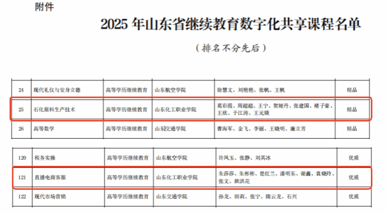 近日,山东省教育厅公布 2025年度继续教育数字化共享课程遴选结果,学院《石化原料生产技术》《直播电商客服》课程分别入选继续教育数字化共享精品课程和优质课程。