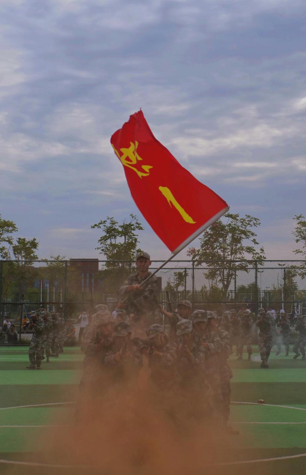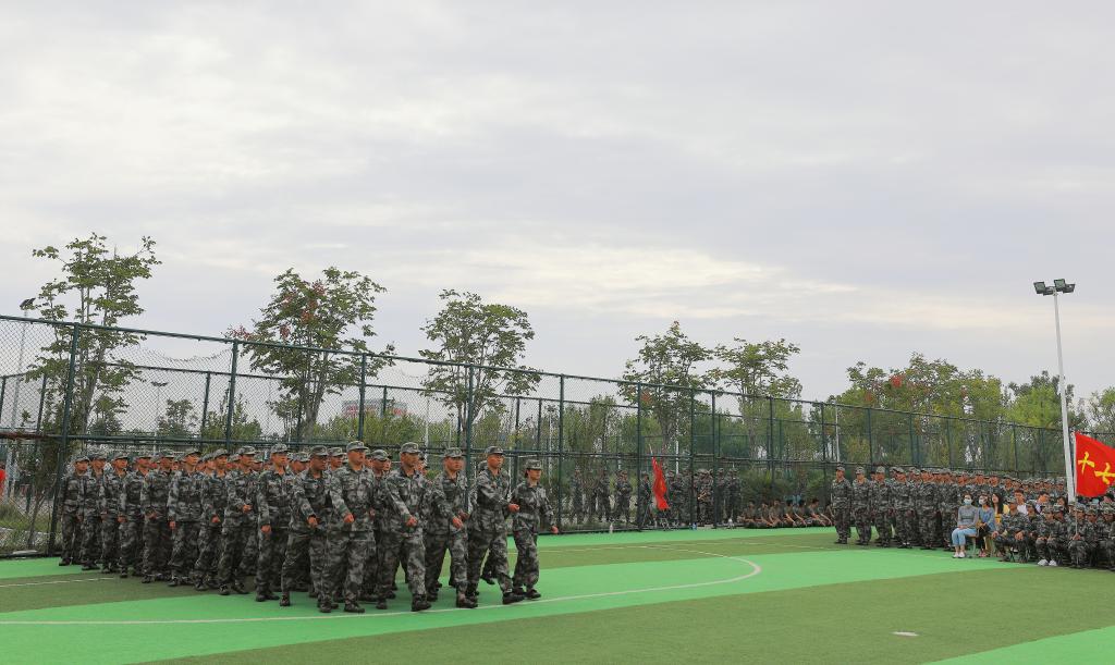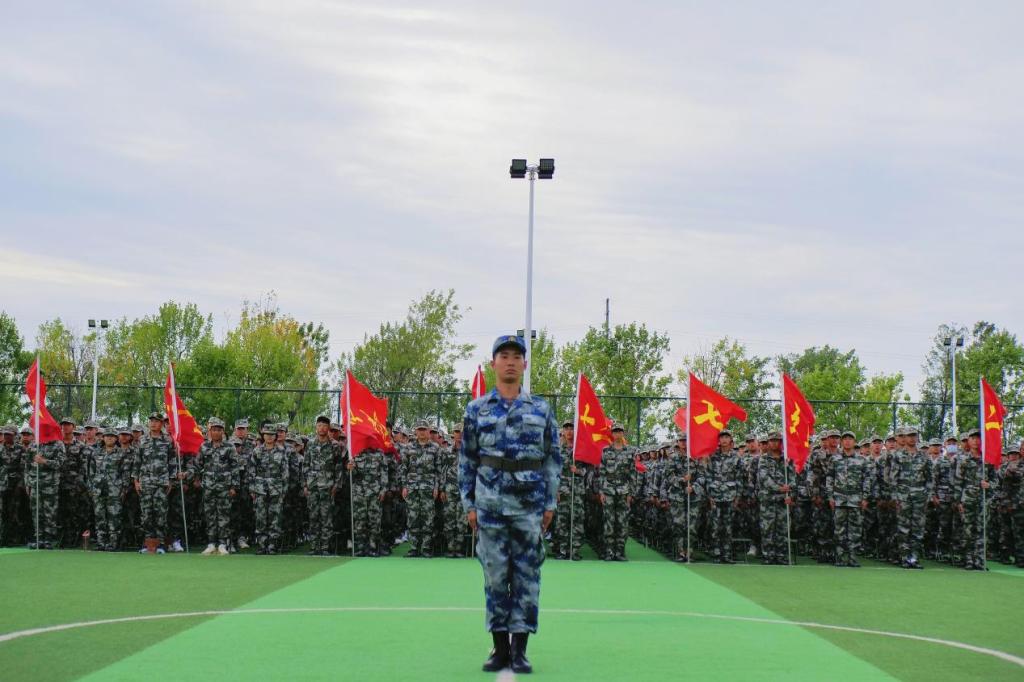 体育场上,身着军装的同学们早已严阵以待。脚步铿锵,衣襟生风,带着一片赤诚之心,大会在庄严肃穆的中华人民共和国国歌中拉开帷幕,全体参会人员起立高唱国歌。
