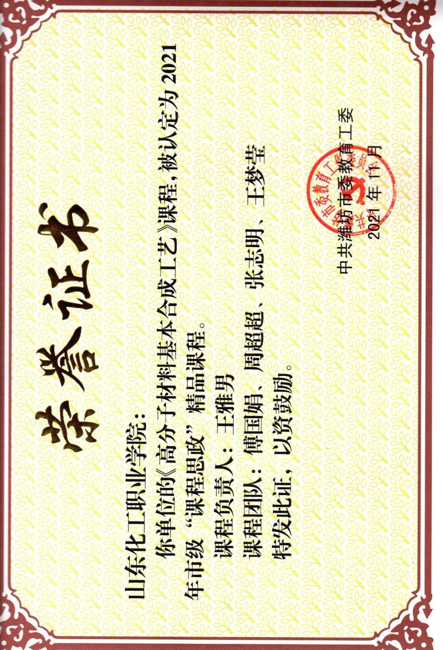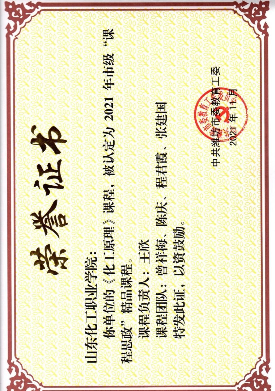 本次化学工程学院共有4个课程团队参加山东化工职业学院校赛,经过激烈角逐,在全校8个团队中,应用化工教研部主任王欣带领《化工原理》团队,材料制造教研部主任王雅男带领《高分子材料基本合成工艺》团队,工业分析教研部主任张宝玲带领《基础化学》团队脱颖而出,被学校推荐参加市级比赛,最终3个课程团队全部荣获2021年市级“课程思政”精品课程。