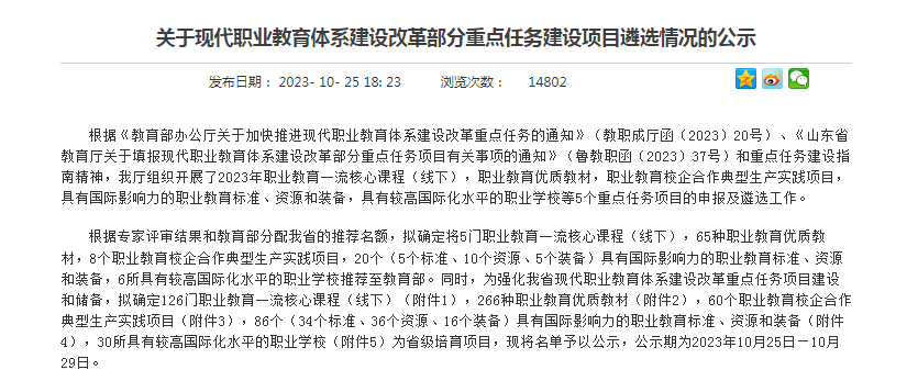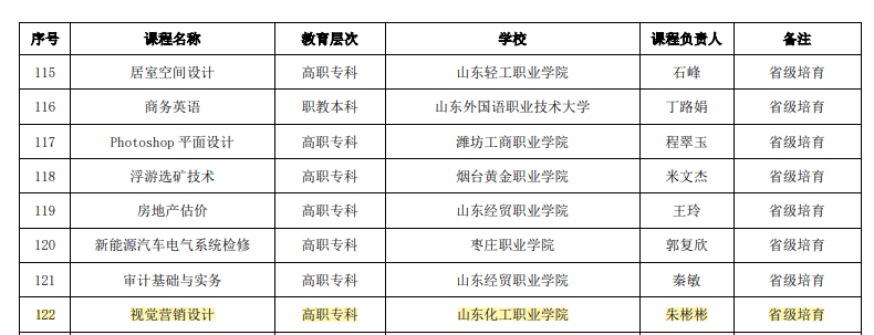 10月25日,山东省教育厅发布《贝博体彩app:现代职业教育体系建设改革部分重点任务建设项目遴选情况的公示》,我校课程团队开发的《视觉营销设计》课程被认定为2023 年职业教育一流核心课程培育项目(线下)。