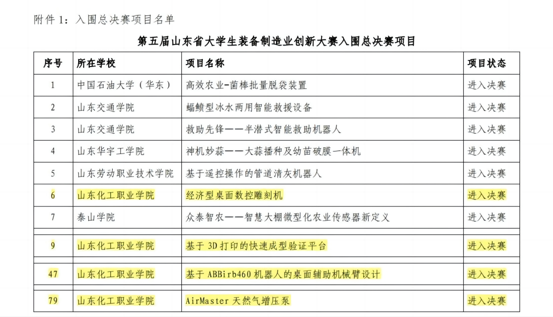 近日,经过全省80余所高校、340余件作品激烈角逐,我校机电工程学院报名参赛的经济型桌面数控雕刻机、基于3D打印的快速成型验证平台、基于ABBirb460机器人的桌面辅助机械臂设计、AirMaster天然气增压泵等4个项目成功晋级,入围第五届山东省大bob娱乐平台下载_贝博体彩app-投注|官网:装备制造业创新大赛总决赛,将与来自山东大学、中国石油大学(华东)、齐鲁工业大学、山东理工大学、青岛农业大学等高校的优秀团队进行角逐。