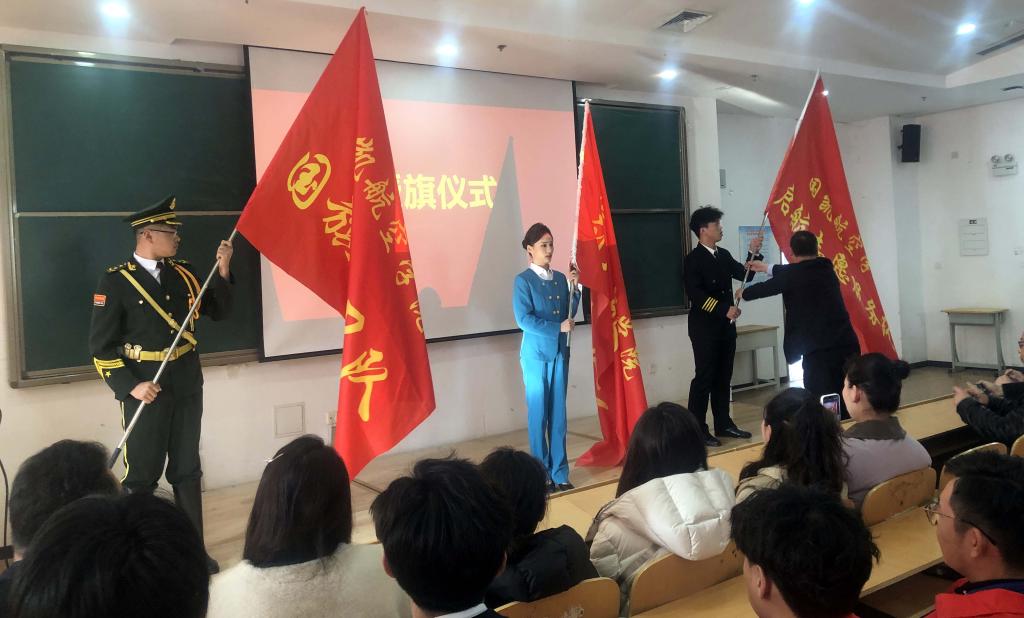 授旗仪式将大会推向高潮。国凯航空学院党支部副书记罗勇分别将国旗护卫队队旗、礼韵服务队队旗和启航志愿服务队队旗授给三个队的队长,队长们接过的不仅仅是一面旗帜,更是荣誉与责任。
