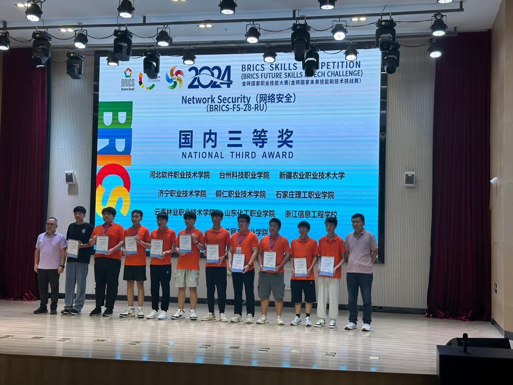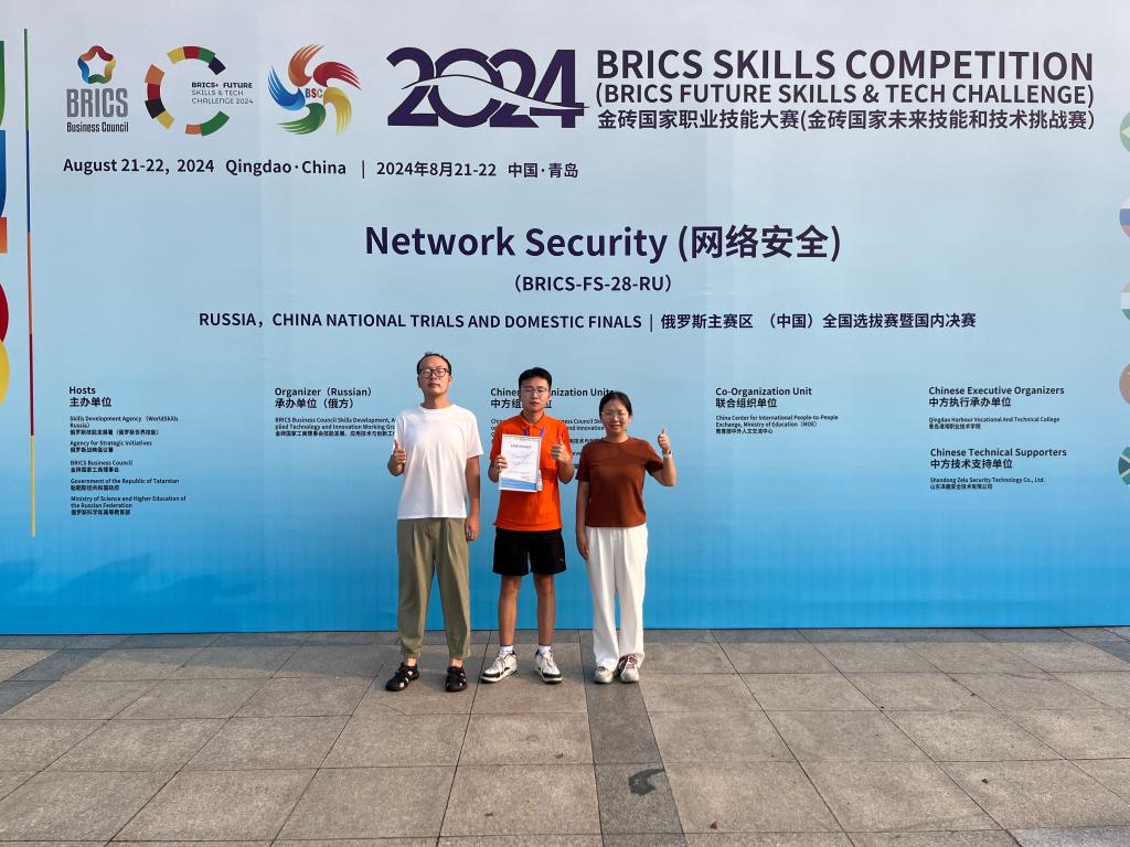 近日在山东青岛举办的2024金砖国家职业技能大赛中,经过激烈的角逐,我校信息工程学院的柴建航同学在牛一菽、孙鹏程等老师的悉心指导下,荣获本次赛事网络安全赛项全国选拔赛暨国内决赛三等奖的好成绩。这一荣誉的取得,既是对信息工程学院在网络安全教育领域辛勤耕耘的充分肯定,亦是对其教学质量与人才培养模式的高度认可。