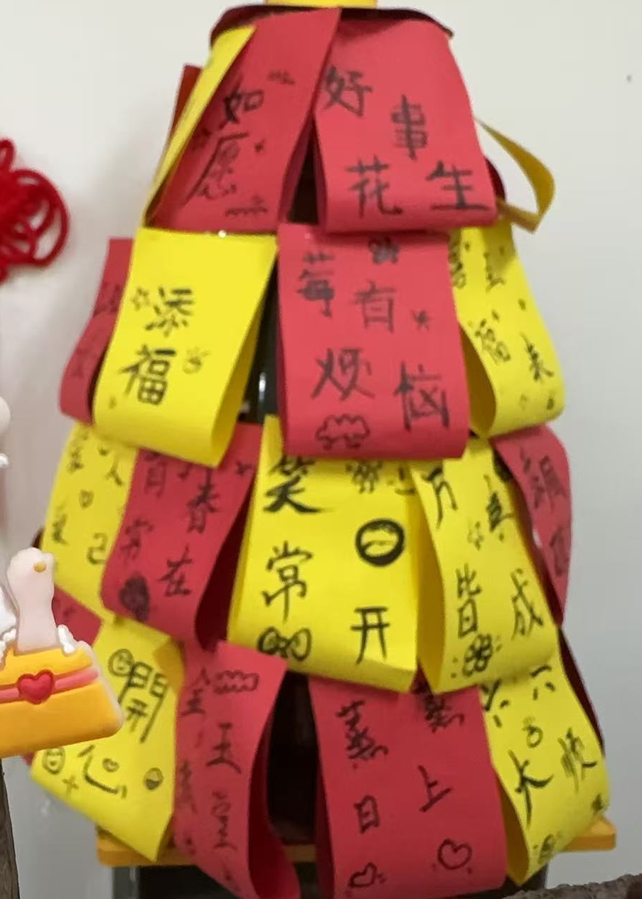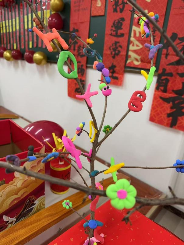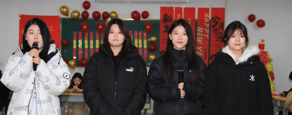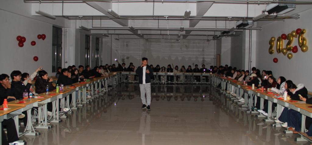 晚会伊始,辅导员赵蓬登台致辞,为同学们送上真挚的新年祝福与殷切期许。为大家逐一送上定制祝愿卡片,并与同学们定下2026年的专属约定:“不旷课、考高分、宿舍卫生比起来”,质朴直白的寄语,满含着对学子们学业进步、生活向好的深切期盼。教室的墙面上,金色的“2026”四字与红红的气球交相辉映,橡皮泥手工花枝缀满真挚的祝福,马年中国结与卡通画相映成趣,手工鞭炮背景板上,辅导员的暖心寄语熠熠生辉。每一处精心布置的细节,都凝聚着班级的向心力与同学们的创造力,勾勒出温馨和谐的集体画卷。