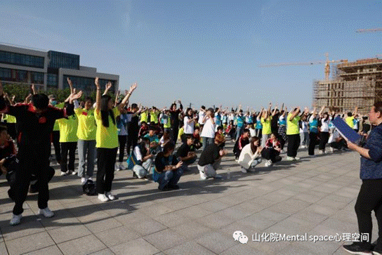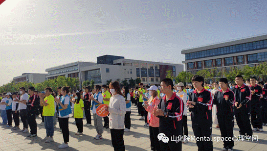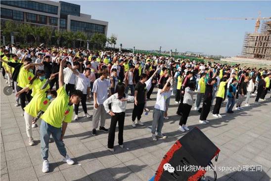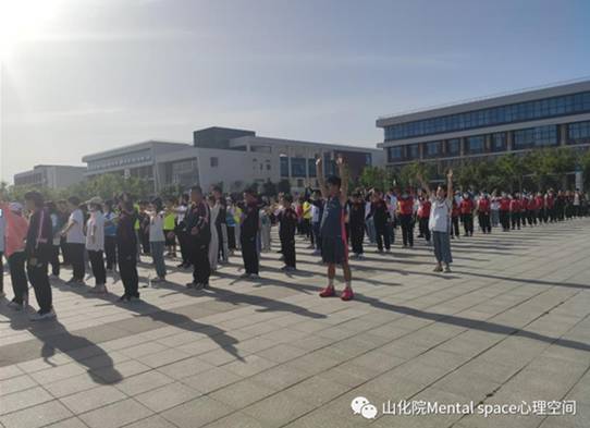 然后,由心理社团4名女生与篮球社4名男生合作,带领全体师生进行热身舞蹈运动。