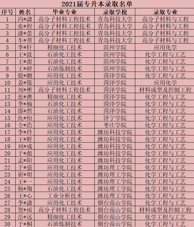 喜报!喜报!山东化工职业学院化学工程学院学子在2021年山东省专升本考试中取得优异成绩,我院2021届毕业生36人报名专升本招生考试,其中30名同学被青岛科技大学等高校录取,录取比例83.3%。