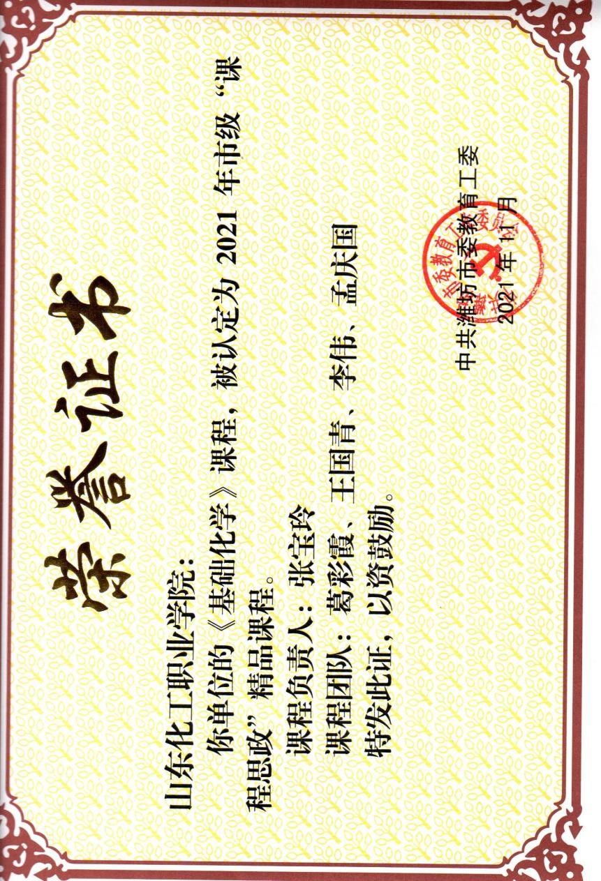 本次化学工程学院共有4个课程团队参加山东化工职业学院校赛,经过激烈角逐,在全校8个团队中,应用化工教研部主任王欣带领《化工原理》团队,材料制造教研部主任王雅男带领《高分子材料基本合成工艺》团队,工业分析教研部主任张宝玲带领《基础化学》团队脱颖而出,被学校推荐参加市级比赛,最终3课程团队全部荣获2021年市级“课程思政”精品课程。